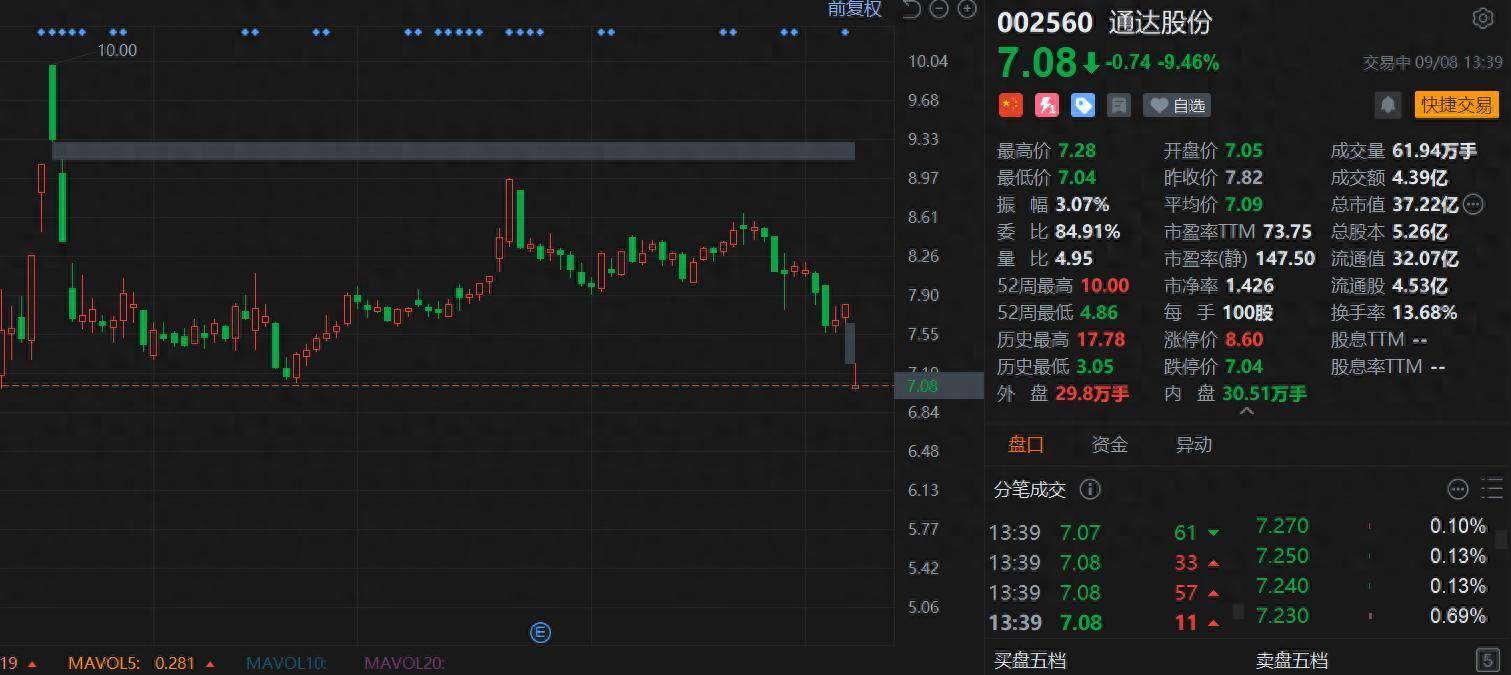 通达股份(002560.SZ)盘中跌停,股价险守7元关口,创今年5月以来新低,总市值37.2亿元。消息上,通达股份上周五晚间公告,公司及相关人员于近日收到河南证监局出具的《关于对河南通达电缆股份有限公司采取责令改正并对马红菊、曲洪普、闫文鸽、刘志坚采取出具警示函监督管理措施的决定》。公司专注于电线电缆研发制造,布局绿色、智能、高效电能传输辉煌国际,航空结构零部件精密加工制造与柔性装配,铝基复合新材料生产制造产业。