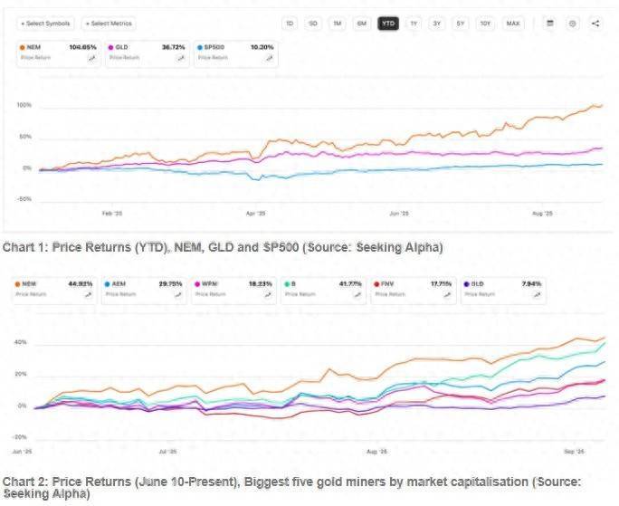 虽然不能否认当前黄金价格的上涨是黄金矿商的基本驱动因素,但纽曼矿业股票的价格回报率远远超过了黄金价格的涨幅。从 SPDR 黄金份额ETF的表现可以看出,截至今年年初,纽曼矿业的股价已经上涨了两倍多,而黄金价格的涨幅约为 35%。从另一个角度来看,它也远远领先于标普500指数。
